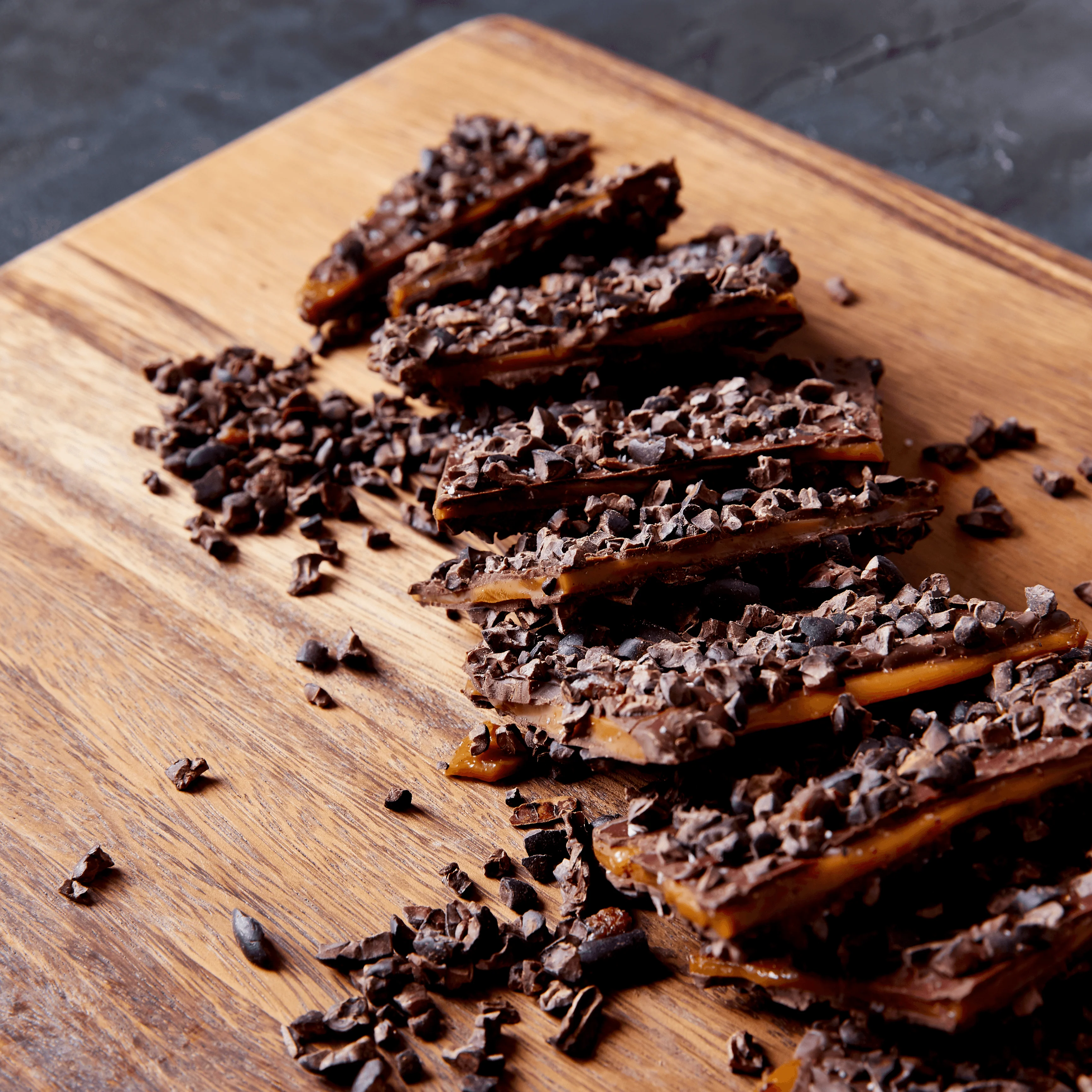 Our Executive Pastry Chef, Lisa Vega, crafted this not-too-sweet traditional toffee for our first Valencia Street cafƩ, and it has been a guest favorite ever since. This is a full pound of dark, crunchy butter toffee is covered in our fudgy, 70% Camino Verde, Ecuador chocolate; studded with nutty, toasted single-origin cocoa nibs to balance sweetness; and lightly sprinkled with sea salt for heightened flavor.