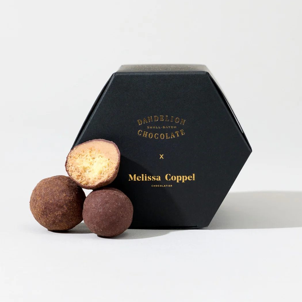 Indulge in the textural experience of these Cinnamon Brioche Dragées by Melissa Coppel. Each bite features a toasted cinnamon-brioche center; a layer of soft, caramelized white chocolate gianduja; crispy wafers; and fruity 70% Kokoa Kamili, Tanzania chocolate. The hazelnuts used to make the gianduja come from a very special Oregon farm called Hazelnut Hill Farm. Each petite round brings out the flavors of a classic French toast in one delectable bite.We are devoted fans of Las Vegas-based chocolatier, pastry chef, and educator Melissa Coppel. Originally from Colombia, Melissa is best known for her inventive flavors and flawless execution.
