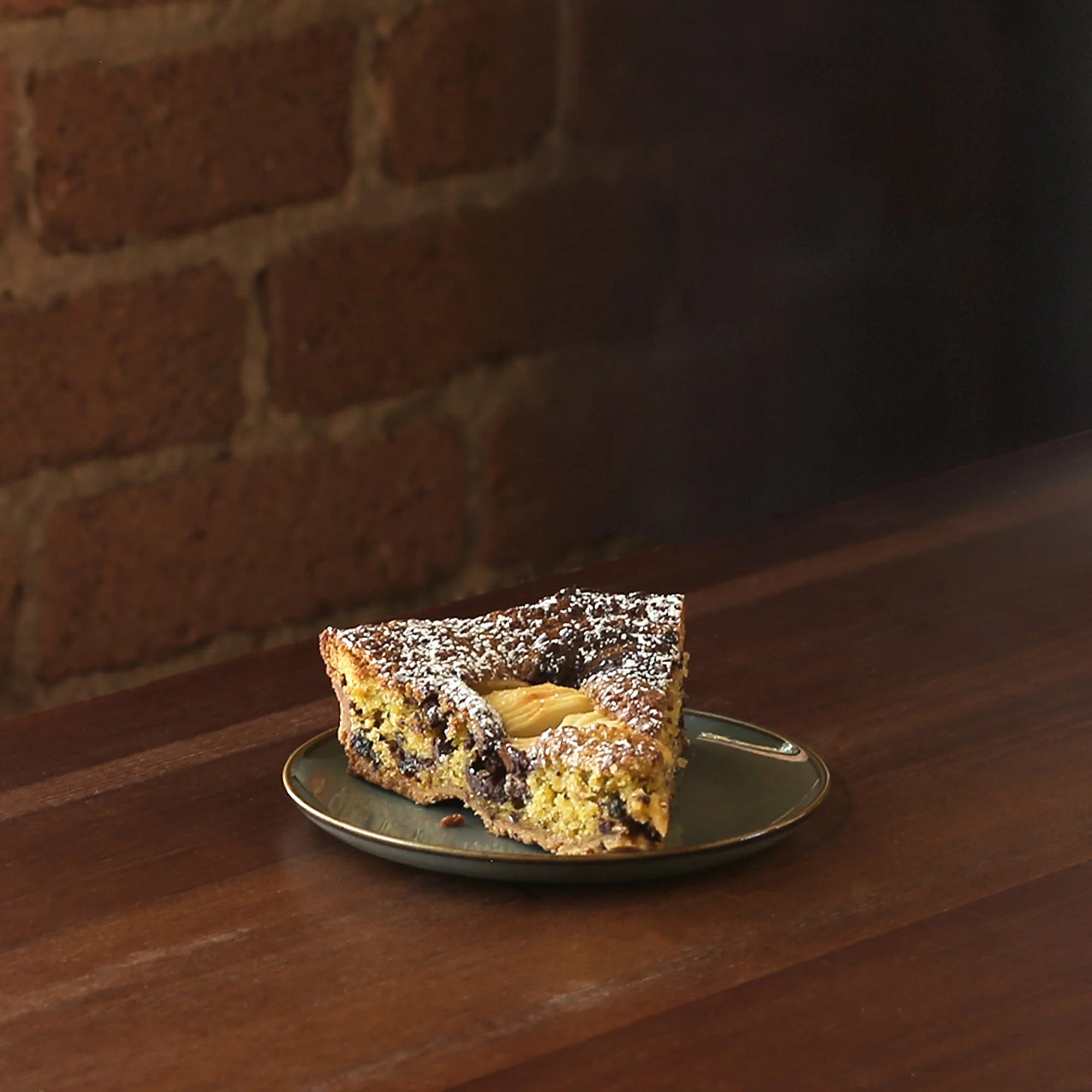As temperatures drop in the City and we bring gatherings indoors, our Pear Frangipane Tart is perfect for potlucks, family dinners, and warm moments. Merging favorite elements of holiday panettone with the shareable presentation of a full tart, we elevate rich frangipane filling with elegant pistachios (rather than almonds); and sprinkle house-candied oranges and local dried currants throughout, eliciting memories of traditional panettone. Fudgy, melted 70% Camino Verde, Ecuador chocolate is swirled into the pistachio frangipane, then the whole is inlaid with tender seasonal pears. The tart is finished with a soft dusting of powdered sugar.